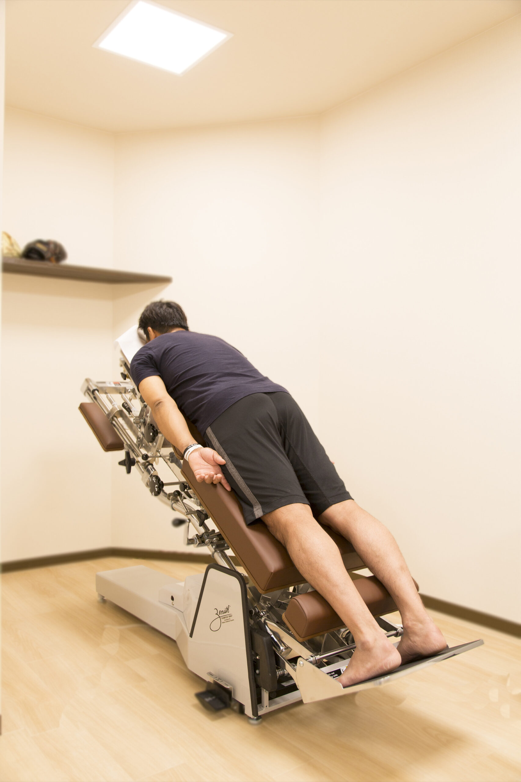 ボキボキ、しない体に楽な施術、従来のカイロプラクティック治療では施術を行うには多少の体力が必要ですが、トムソンテーブルでは、患者様を寝たまま最小の力で安全にゆがみの矯正ができるので、患者様にも負担が少なく楽に施術できます。